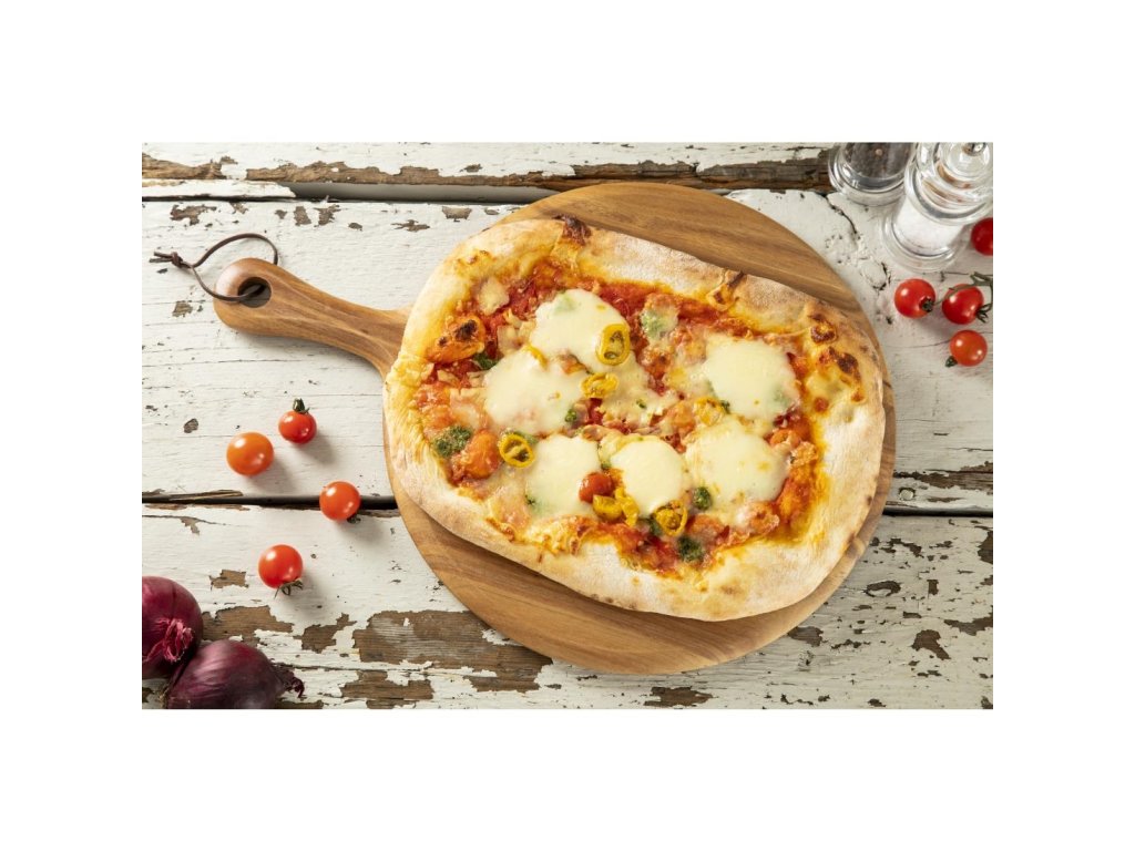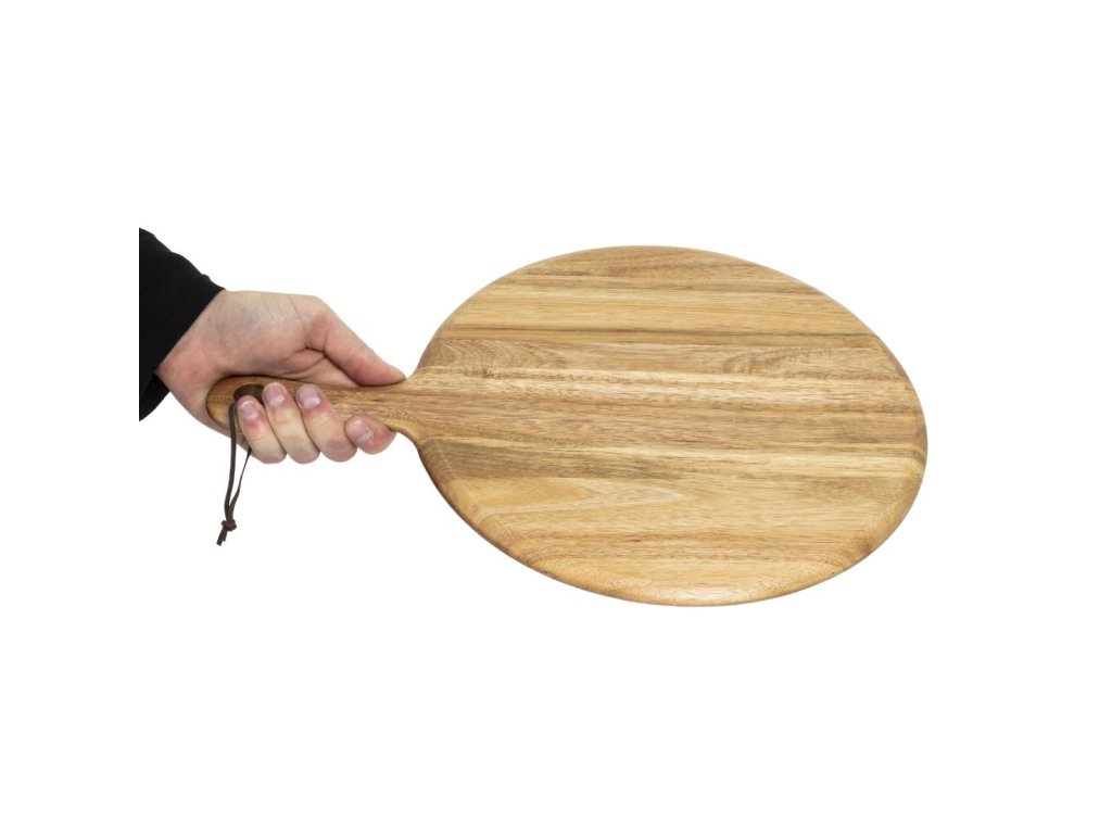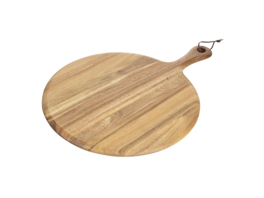 Okrúhla akáciová doska s rustikálnym vzhľadom pre štýlovú prezentáciu na stole. Vybavené koženým pútkom.