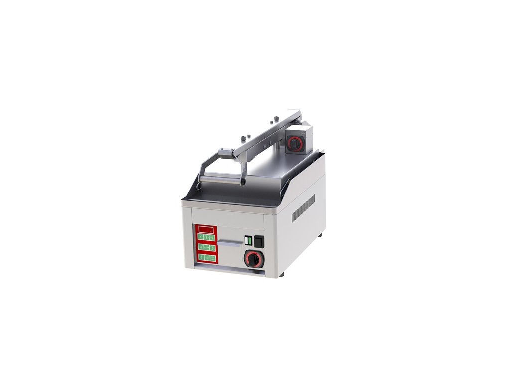 rozmer: 330x780x440mm(šxhxv); príkon elektro: 3kW/230V + 3kW/230V; rozmer platne: 320x480mm(šxh); rozmer vrchnej platne: 280x400mm(šxh); regulácia teploty: 50–300°C ; ovládanie: elektronické, programovateľné; otváranie: automatické; prevedenie:; -spodná platňa chromovaná, hladká; -vrchná platňa s teflónovým plátnom, hladká; každá platňa samostatne ovládaná; zásuvka na odkvapkávajúci tukDiskusia