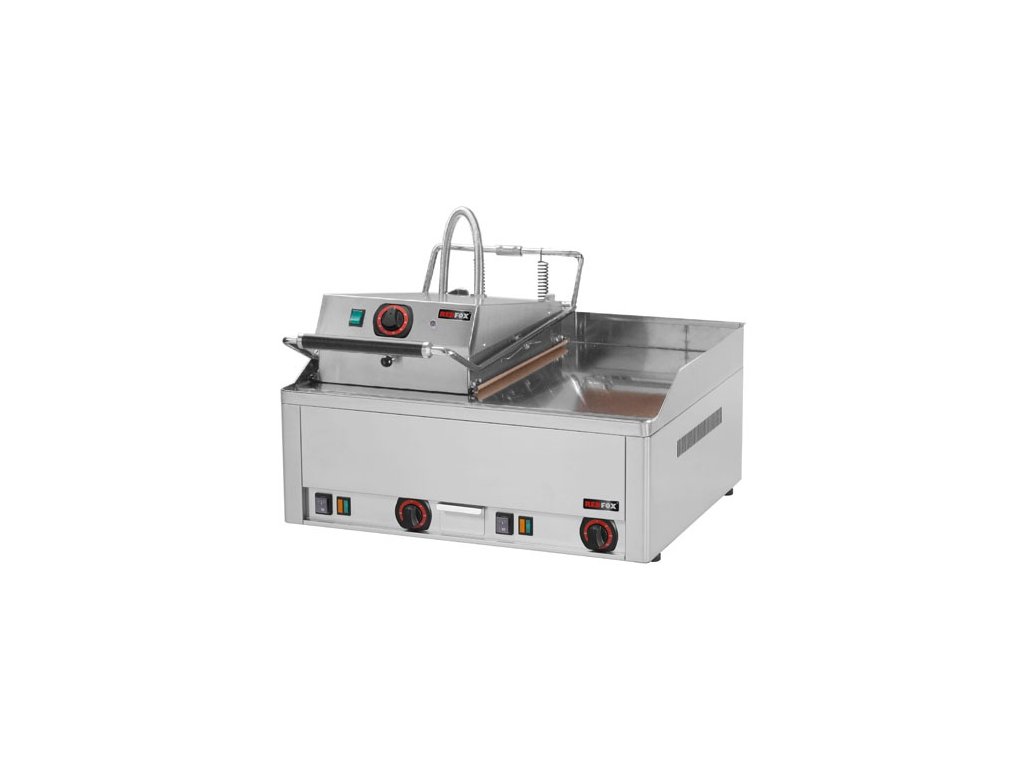rozmer: 660x660x400mm(šxhxv); príkon elektro: 6kW/400V + 3kW/230V; rozmer platne: 650x480mm(šxh); rozmer vrchnej platne: 320x380mm(šxh); regulácia teploty: 50–300°C; prevedenie: ; -spodná platňa durable chróm, hladká; -vrchná platňa s teflonovým plátnom, hladká; každá platňa samostatne ovládaná; zásuvka na odkvapkávajúci tukDiskusia