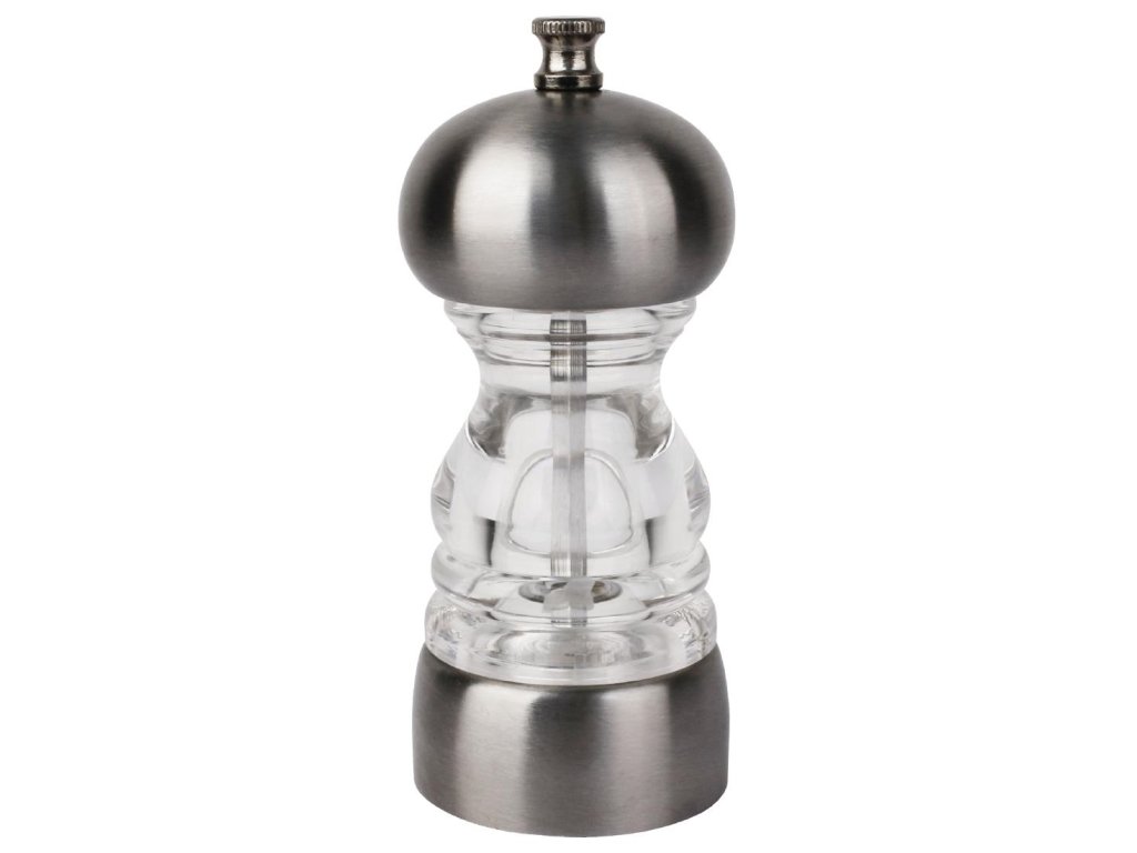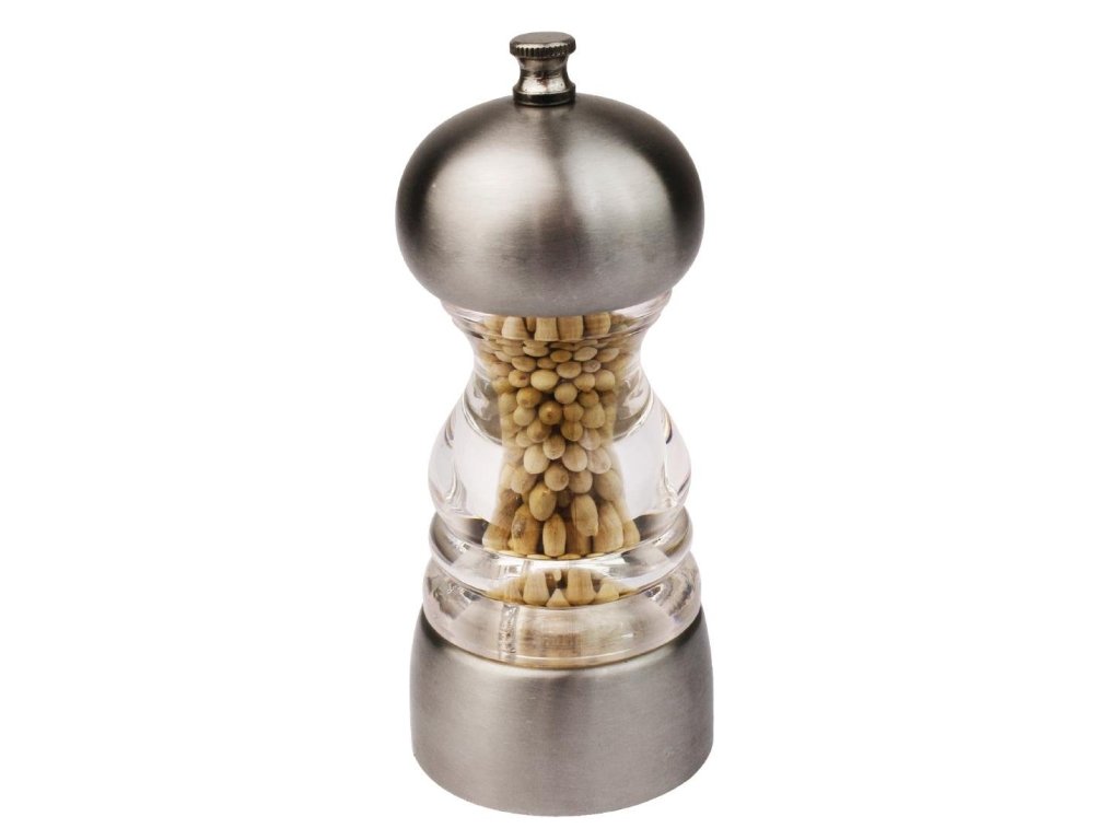 Brúsená nehrdzavejúca oceľ a akrylový mlynček v klasickom tvare, možno použiť so soľou alebo korením. Nastaviteľný keramický mechanizmus na hrubé alebo jemné mletie.