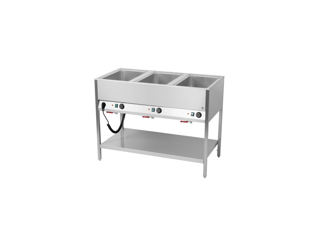 rozmer: 1200x600x900mm(šxhxv); príkon elektro: 2,1kW/230V; kapacita: 3 x GN1/1 - 200mm; regulácia teploty: 30-90°C; ovládanie na dlhšej strane; samost. ovládanie každej vane; 3 x výpustný ventil; polica; príslušenstvo na objednávku: ; -gastronádobyDiskusia