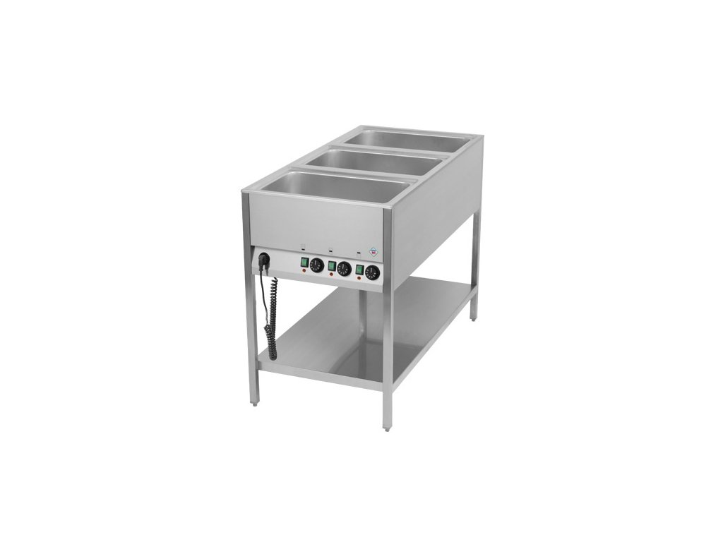 rozmer: 1200x600x900mm(šxhxv); príkon elektro: 2,1kW/230V; kapacita: 3 x GN1/1 - 200mm; regulácia teploty: 30-90°C; ovládanie na kratšej strane; samost. ovládanie každej vane; 3 x výpustný ventil; polica; príslušenstvo na objednávku: ; -gastronádobyDiskusia