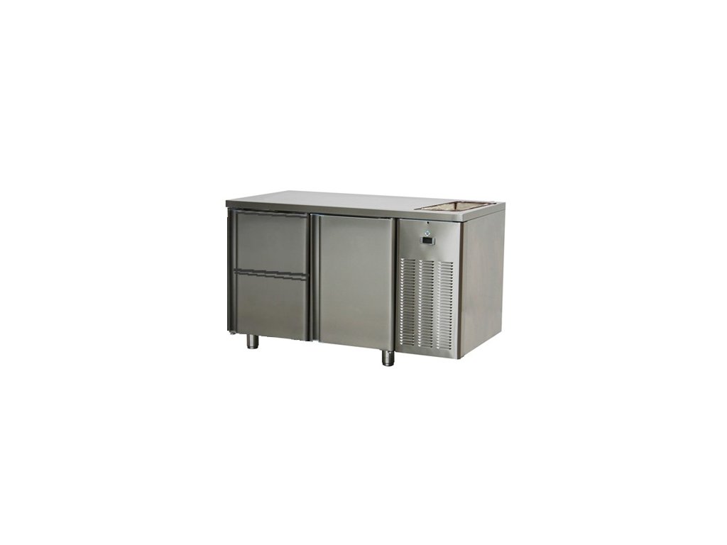 rozmer: 1380x700x900mm(šxhxv); príkon elektro: 0,32kW/230V; pre uloženie GN1/1; 1 x dvere; 1 x zásuvkový set ZS1212 (2 x zásuvka s hĺbkou 200mm); chladenie: ventilované; chladiaci agregát vpravo; prev. teplota: -2/+8°C; pracovná doska s lemom; pracovná doska s otvorom na batériu; elektronická riadiaca jednotka; max. TEPLOTA OKOLIA do: +43°C; energetická trieda: C; IZOLÁCIA: 70mm; elektronické RIADENIE VLHKOSTI; drez 340x400x165mm nad agregátom; základné príslušenstvo: 1x rošt; príslušenstvo na objednávku: ; -zásuvkový set ZS1212 (2 x zásuvka s hĺbkou 200mm); -zásuvkový set ZS131313 (3 x zásuvka s hĺbkou 100mm); -horná doska bez lemu; -granitová doska bez lemu; -agregát vľavo; -zámokDiskusia