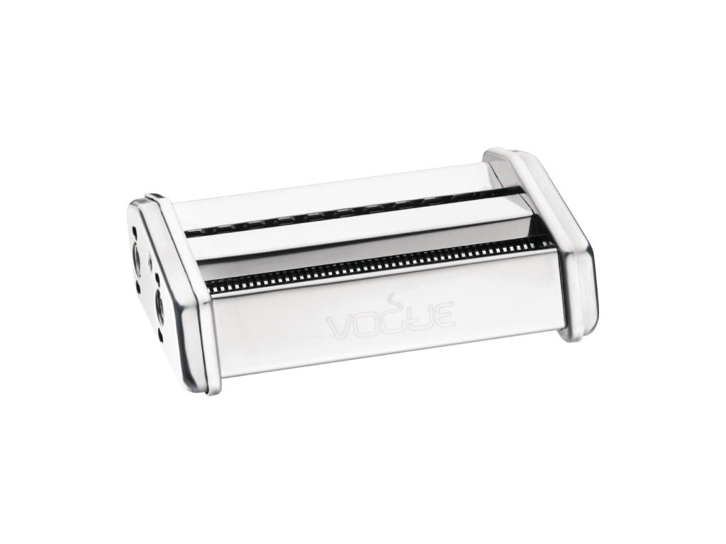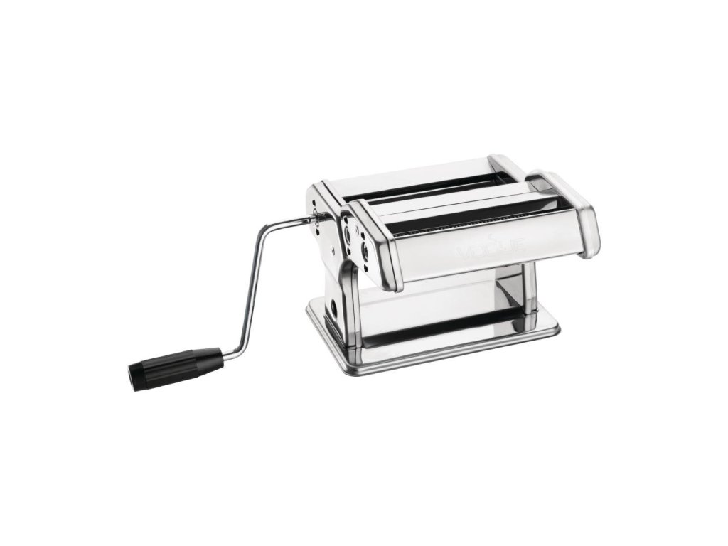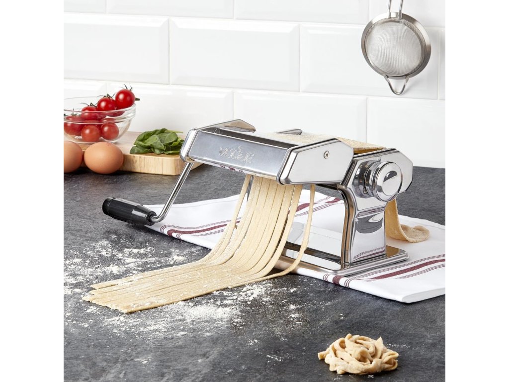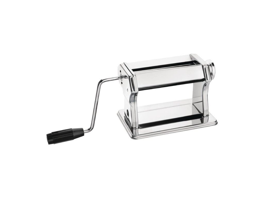 Strojček na cestoviny z chrómovanej ocele s poniklovanými valčekmi. Cesto je možné vyrobiť v rôznych hrúbkach a 2 šírkach.