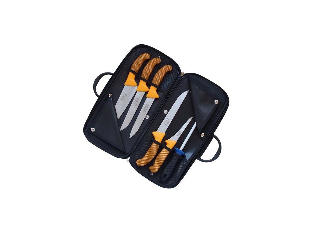 ocieľka 10 - 38cm; nôž vykosťovací 13cm; nôž hornošpicatý 17cm; nôž strednešpicatý 17cm; nôž mäsiarsky 20cm; nôž porcovací 20cm