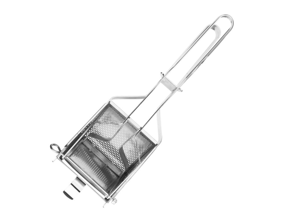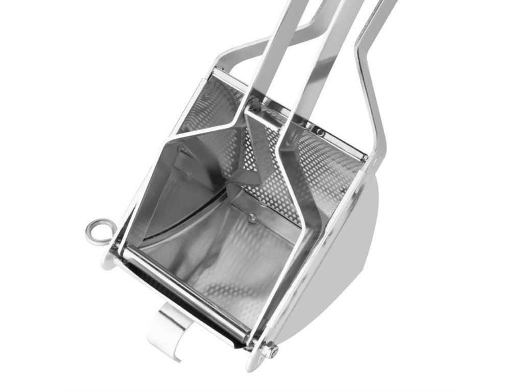 Veľký nerezový lievik s odnímateľným horným sitkom pre jednoduché čistenie. 11 (v) x 11,5 (š) x 14 (h) cm. Dĺžka s rukoväťou 39 cm.