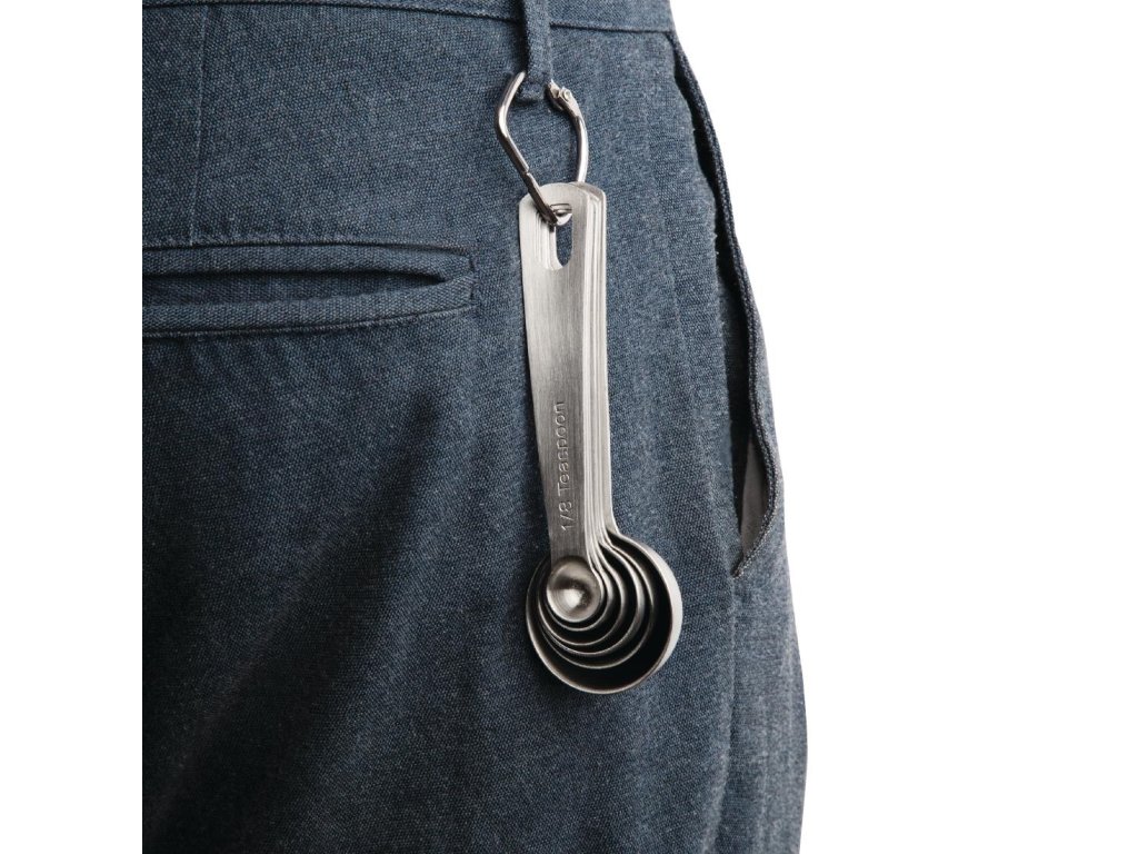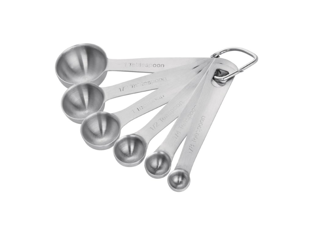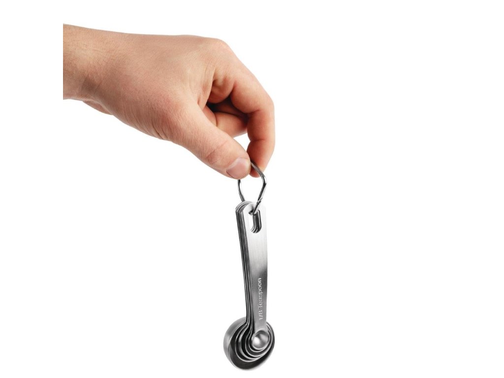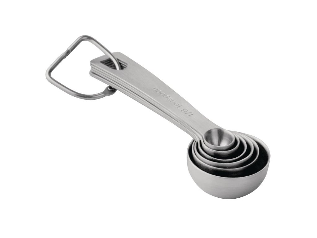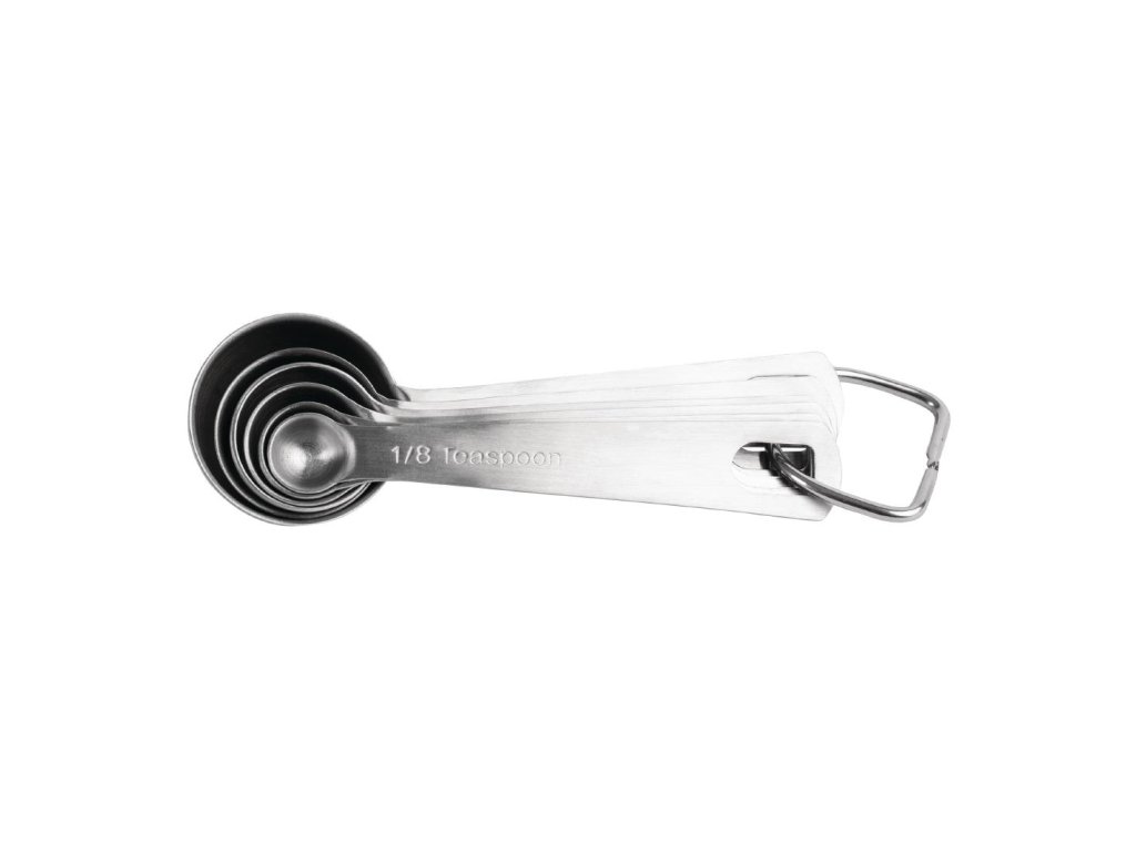 Nehrdzavejúca oceľ. Obsah: 1/8 (0,62 ml), 1/4 (1,25 ml), 1/2 (2,5 ml), 1 čajová lyžička (5 ml) a 1 polievková lyžica (15 ml).