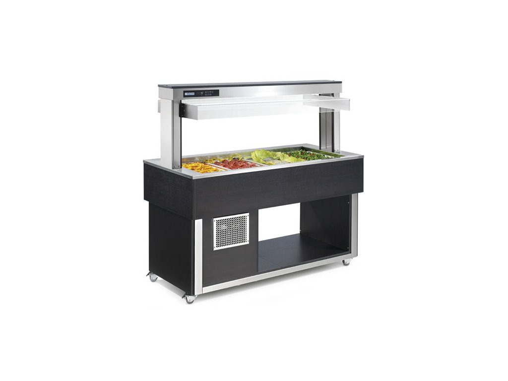 rozmer: 1494x650x1488mm(šxhxv); príkon elektro: 0,25kW/230V; kapacita: 4 x GN1/1 - 200mm; chladenie: statické; prev. teplota: +4/+8°C; elektronická riadiaca jednotka; prevedenie: wenge; RAL za príplatok +10%; 4 kolieska, 4 brzdené; nerezová vaňa; podstavba: krytovaná z bokov so spodnou policou; nadstavba: pevná s odkladacou policou; elektrické spúšťanie a zdvíhanie zákrytu; LED osvetlenie; max. teplota/vlhkosť okolia +25°C / 60%R.H.; príslušenstvo na objednávku:; -bočné manipulačné plochy ; -prídavné vstavané skrinky; -gastronádobyDiskusia