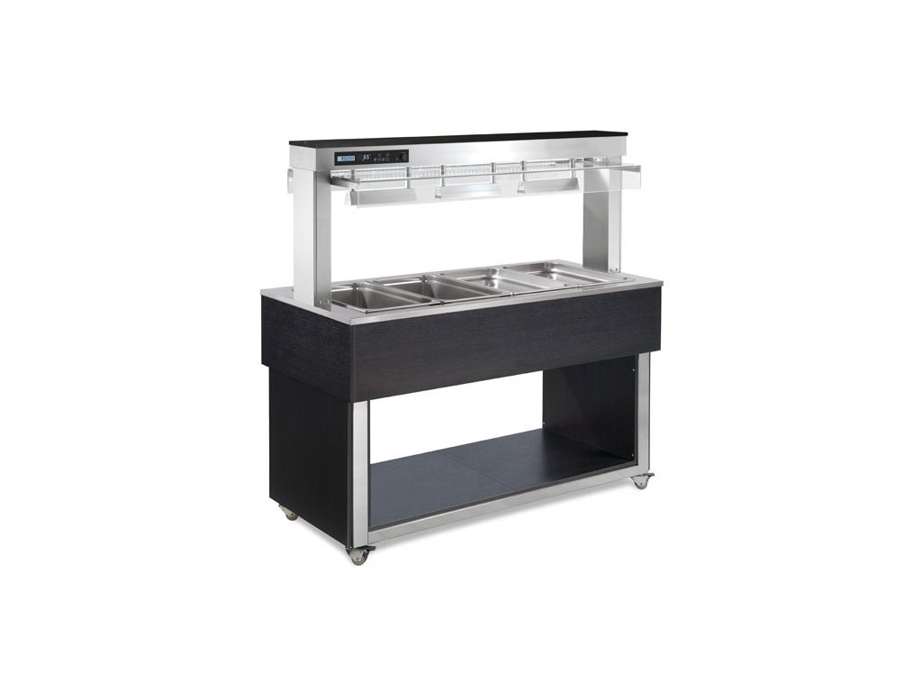 rozmer: 1494x650x1488mm(šxhxv); príkon elektro: 3,1kW/230V; kapacita: 4 x GN1/1 - 200mm; ohrevné halogénové lampy; regulácia teploty: +60/+90°C; elektronická riadiaca jednotka; výpusť do podstavby; prevedenie: wenge; RAL za príplatok +10%; 4 kolieska, 2 brzdené; nerezová vaňa; telesá mimo vane; elektronická ochrana proti nedostatku vody; podstavba: krytovaná z bokov so spodnou policou; nadstavba: pevná s odkladacou policou; regulácia výkonu horných ohrevných lámp; príslušenstvo na objednávku:; -bočné manipulačné plochy ; -prídavné vstavané skrinky; -gastronádobyDiskusia