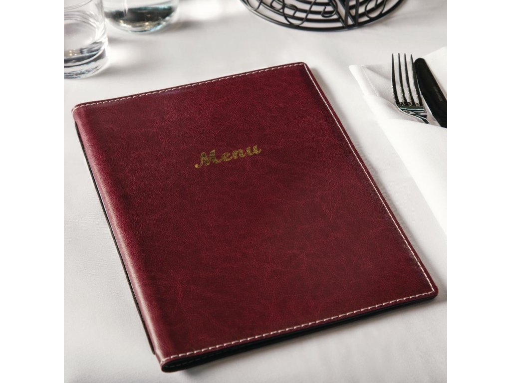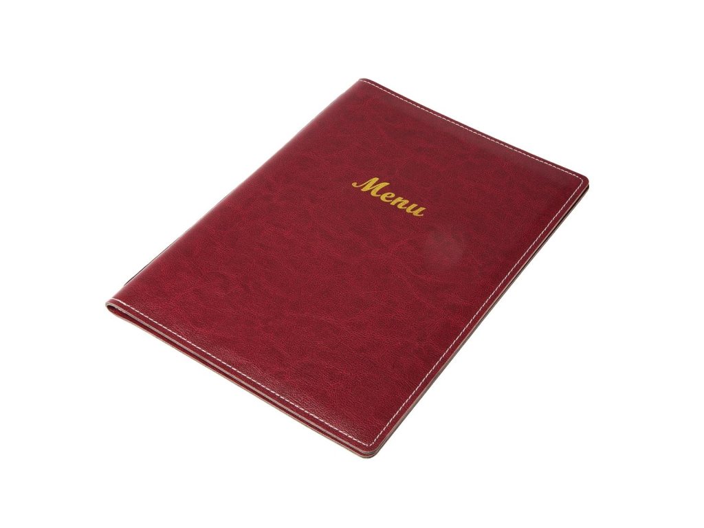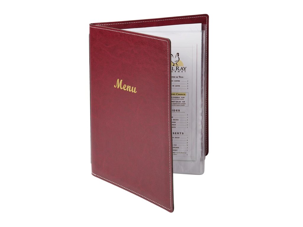 Odolné držiaky menu A4 alebo A5 s koženým efektom so štyrmi bočnými displejmi ako štandard. Na doplnenie menu si môžete zakúpiť priehľadné priečinky so zlatou šnúrkou (predávajú sa samostatne). Menu nie je zahrnuté.